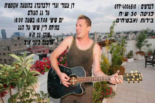 זו תהיה הופעת unplugged (יעני, בלי פלאג (; ) , אקוסטית. עדי ינגן קלידים, כינור וחליליות ואני על גיטרה ושירה. ההופעה תיערך על גג מדהים בדרום תל אביב, ארבעה כיווני אוויר ונוף על כל העיר כולל הים, נוה צדק והדאונטאון בשעת השקיעה, ביום ו' הבא לפנות ערב. בירות אבטיחים ובריזה. זו תהיה הופעה ראשונה בפורמט הזה, למרות שעדי ואני מנגנים ביחד כבר מגיל 16, ואת מיטב שנות נעורנו העברנו בנגינה משותפת סביב מדורות בפרדסים של רחובות, במכתשים בהרים, בנחלים ובחופי הים, לצורך הרשמת בחורות ומזמוזן. ננגן שירים חדשים וישנים, וגם כמה קאברים מפתיעים, וזו תהיה הזדמנות להעמיק קצת יותר בטקסטים, בלחנים, ובמקורות ההשראה שלנו. ההופעה תהיה ונילית למהדרין וחפה מקטעים 'תיאטרלים' ולפיכך מתאימה לכולם. יום ו' 18.7.08 על גג העולם שוקן 22 ת"א (מעל פלאפל ג'ינה, כניסה מפינת רחוב העמל, קומה 4 במעלית) 18:00 30 ש"ח יהיה קסום