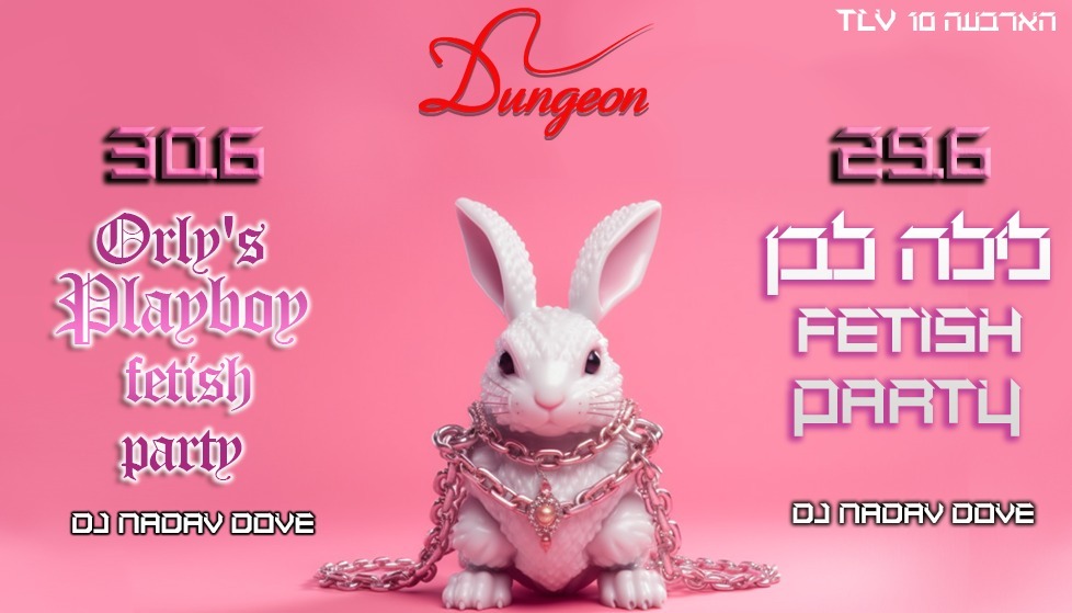 חמישי 29.6 פתיחה בשעה 23:30 White Night Fetish Party Dj Nadav Dove השבוע בחמישי יתקיימו ברחבי העיר תל אביב אירועי הלילה הלבן המסורתי גם השנה מועדון הדאנג'ן מצטרף לאירועי הלילה הלבן, פותח את שעריו ומזמין את החוגגים לחוויה אחרת, לטעימה מהעולם הקינקי שהוא מנת חלקנו לאורך השנה כולה באופן חד-פעמי הכניסה חינם בשעה הראשונה (עד 00:30) ואין צורך בדרס קוד (קוד לבוש חופשי, אך עדיין מכובד. לא תתאפשר כניסה עם מכנסיים קצרים וכפכפים) המועדון מזמין אתכם לבוא ולחוות איתנו את ערב הדגל של המועדון כבר למעלה מ-20 שנים! שימו לב - גם בלילה הלבן הכניסה היא באיזון מגדרי בלבד. מיטב הפרפורמרים שלנו יופיעו על הבמה, על עמוד הריקודים ועל החישוק לאורך הלילה כולו ויטה ואירה הרקדניות המהממות מגיעות לעשות בלגן לרכישת כרטיסים במכירה מוקדמת עד חמישי בשעה 22:00 (כרטיס זוגי באיזון מגדרי בלבד, המחיר בקופה יקר יותר): https://dungeon.co.il/events/white-night-fetish-party-29-6/ שישי 30.6 פתיחה בחצות Orly's Playboy Fetish Party & Alex Birthday Dj Nadav Dove ברוכים הבאים לאחוזת הפלייבוי של יו הפנר ולמסיבת השפנפנות המסורתית שלנו. בשישי הקרוב האחוזה הכי שובבה בעולם מגיעה לדאנג'ן חוגגים יום הולדת שמח ופרוע במיוחד לשפנפנת החודש שלנו - אלכס שלושת השפנפנות הראשונות תקבלנה כניסה חינם באהבה מאיתנו Would you like to be a Honey Bunny? הצוות שלנו יחלק בתחילת הערב אוזני שפנפנה מדליקות בשלל צבעים מופעים מיוחדים על הבמה ברוח נושא המסיבה, את השאר אנחנו לא מגלים כי אנחנו לא רוצים להרוס את ההפתעה לרכישת כרטיסים במכירה מוקדמת עד שישי בשעה 22:00 (כרטיס זוגי באיזון מגדרי בלבד, המחיר בקופה יקר יותר): https://dungeon.co.il/events/orlys-playboy-fetish-party-30-6/ החנות החדשה שלנו פתוחה במהלך המסיבות! The Dungeon Shop - עשרות מוצרים בהנחות של עד 50% לרגל הפתיחה http://gtoy.co.il/ הכניסה למסיבות מגיל 18 ומעלה ובדרס קוד בלבד: כל מה שקינקי ופטישיסטי, מינימום לבוש שחור מלא ובלי ג'ינס כחול. יש להגיע עם תעודת זהות/רישיון נהיגה (לא צילום בטלפון). יש להישמע להוראות המאבטחים ואנשי הצוות בכניסה ובמקום עצמו. מתחם המבוך החדש, המוגדל והמשודרג המפורסם בכל העיר. הכניסה למתחם המבוך לזוגות בלבד. הצילום בכל רחבי המועדון אסור בהחלט! הדאנג’ן – הבית לחובבי הפטיש קינק והסאדו מאזו בישראל מאז 2002, אז תנסו את זה בבית. מוזמנים לעקוב אחרינו גם באינסטגרם ובטלגרם https://www.instagram.com/dungeon_tlv --telegram-- בשביל מיינסטרים יש מקומות אחרים הארבעה 10 | תל אביב יש חניון שעומד לרשותכם, חניון גבעון – במחיר מסובסד של 10 ש"ח לכל הלילה. מחתימים את הכרטיס בקופת הדאנג'ן