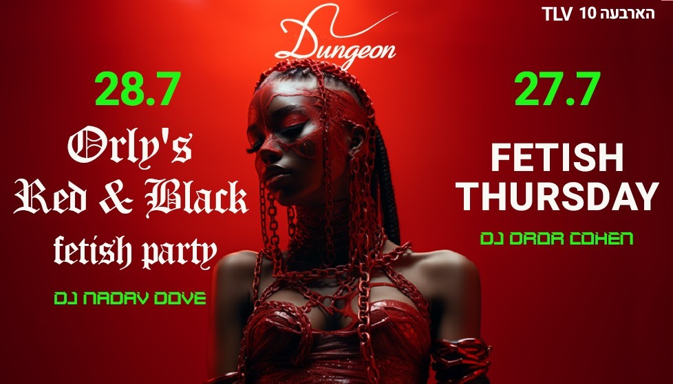 חמישי 27.7 פתיחה בשעה 23:30 Fetish Thursdays Dj Dror Cohen פותחים את הסופ"ש בסערה עם ערב הדגל של המועדון כבר למעלה מ-20 שנה המופע המרכזי על הבמה - קטיה ואדיר בסשן מלא באהבה וכאב צוות הפרפורמרים שלנו על הבמה, עמוד הריקודים והחישוק לאורך הלילה כולו לרכישת כרטיסים במכירה מוקדמת עד חמישי בשעה 22:00 (כרטיס זוגי באיזון מגדרי בלבד, המחיר בקופה יקר יותר): https://dungeon.co.il/events/fetish-thursdays-27-7/ שישי 28.7 פתיחה בחצות Orly's Red & Black Fetish Party Dj Nadav Dove בשישי בלילה עושים את זה בצבעים מסיבה פטישיסטית באדום ושחור, עם המון מצב רוח קינקי ושובב Red is your love & Black is your soul לילה מלא בסיפוק חושני ופטישיסטי, עולם פנטסטי ואפל, תאורה אפלולית ואווירה סקסית על הבמה המרכזית שלנו הופעות כל הלילה הדרס קוד לערב בנוסף לשחור: אדום לרכישת כרטיסים במכירה מוקדמת עד שישי בשעה 22:00 (כרטיס זוגי באיזון מגדרי בלבד, המחיר בקופה יקר יותר): https://dungeon.co.il/events/orlys-red-black-fetish-party-28-7/ החנות החדשה שלנו פתוחה במהלך המסיבות! The Dungeon Shop - עשרות מוצרים בהנחות של עד 50% לרגל הפתיחה http://gtoy.co.il/ הכניסה למסיבות מגיל 18 ומעלה ובדרס קוד בלבד: כל מה שקינקי ופטישיסטי, מינימום לבוש שחור מלא ובלי ג'ינס כחול. יש להגיע עם תעודת זהות/רישיון נהיגה (לא צילום בטלפון). יש להישמע להוראות המאבטחים ואנשי הצוות בכניסה ובמקום עצמו. מתחם המבוך החדש, המוגדל והמשודרג המפורסם בכל העיר. הכניסה למתחם המבוך לזוגות בלבד. הצילום בכל רחבי המועדון אסור בהחלט! הדאנג’ן – הבית לחובבי הפטיש קינק והסאדו מאזו בישראל מאז 2002, אז תנסו את זה בבית. מוזמנים לעקוב אחרינו גם באינסטגרם ובטלגרם https://www.instagram.com/dungeon_tlv --telegram-- בשביל מיינסטרים יש מקומות אחרים הארבעה 10 | תל אביב יש חניון שעומד לרשותכם, חניון גבעון – במחיר מסובסד של 15 ש"ח לכל הלילה. מחתימים את הכרטיס בקופת הדאנג'ן
