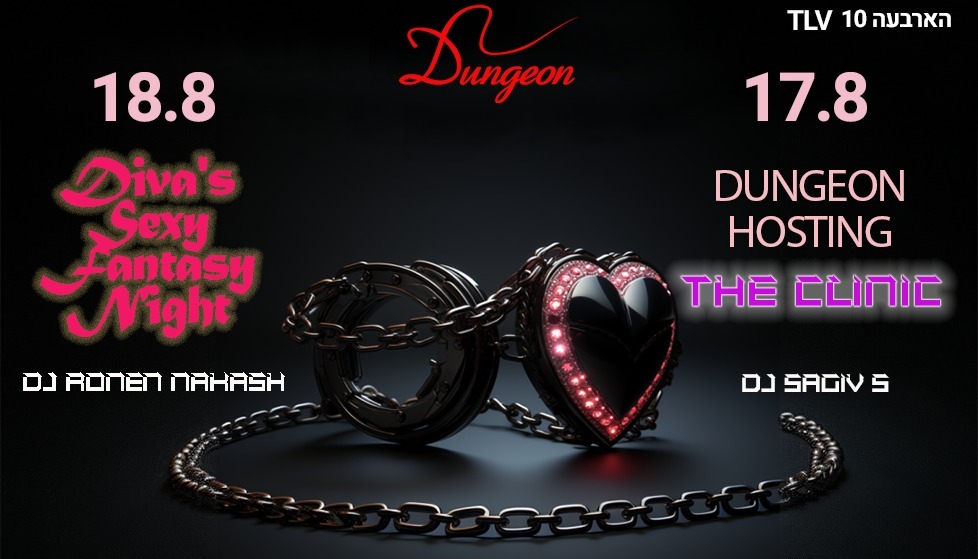 חמישי 17.8 פתיחה בשעה 23:30 Dungeon hosting The Clinic Fetish Party Dj Sagiv S. המסיבה החודשית המשותפת של הדאנג'ן עם ליין הקליניקה בכל העיר כבר יודעים איפה נמצאים פעם בחודש כל האנשים הנכונים מארחים את ניקה על עמוד הריקודים המופע המרכזי על הבמה - רועי בעל הנס, Jadis White & Hodaya לרכישת כרטיסים במכירה מוקדמת עד חמישי בשעה 22:00 (כרטיס זוגי באיזון מגדרי בלבד, המחיר בקופה יקר יותר): https://dungeon.co.il/events/dungeon-hosting-the-clinic-fetish-party-17-8/ שישי 18.8 פתיחה בחצות Diva's Sexy Fantasy Night Dj Ronen Nakash משחררים את הפנטזיות לאוויר בליין של דיווה דרס קוד יוניק - שימו 💜 סגול 💗 ורוד, בנוסף לשחור, דמויות פנטזיה סקסיות ושוות. פרס שווה לזוג המשקיע בלבוש: כניסה זוגית למסיבת יום ההולדת של יניר, הבעלים של הדאנג'ן, שתיערך בחמישי 24.8 (Save the Date) 🥰 חוגגים ימי הולדת לשלושה חברים שווים שלנו על הבמה - הופעת שיבארי עוצרת נשימה של דום ראגנר והקטנה שלו קטרינה vs אדיר ישרפו את הבמה לרכישת כרטיסים במכירה מוקדמת עד שישי בשעה 22:00 (כרטיס זוגי באיזון מגדרי בלבד, המחיר בקופה יקר יותר): https://dungeon.co.il/events/divas-sexy-fantasy-night-18-8/ החנות החדשה שלנו פתוחה במהלך המסיבות! The Dungeon Shop - עשרות מוצרים בהנחות לרגל הפתיחה http://gtoy.co.il/ הכניסה למסיבות מגיל 18 ומעלה ובדרס קוד בלבד: כל מה שקינקי ופטישיסטי, מינימום לבוש שחור מלא ובלי ג'ינס כחול. יש להגיע עם תעודת זהות/רישיון נהיגה (לא צילום בטלפון). יש להישמע להוראות המאבטחים ואנשי הצוות בכניסה ובמקום עצמו. מתחם המבוך החדש, המוגדל והמשודרג המפורסם בכל העיר. הכניסה למתחם המבוך לזוגות בלבד. הצילום בכל רחבי המועדון אסור בהחלט! הדאנג’ן – הבית לחובבי הפטיש קינק והסאדו מאזו בישראל מאז 2002, אז תנסו את זה בבית. מוזמנים לעקוב אחרינו גם באינסטגרם ובטלגרם https://www.instagram.com/dungeon_tlv --telegram-- בשביל מיינסטרים יש מקומות אחרים הארבעה 10 | תל אביב יש חניון שעומד לרשותכם, חניון גבעון – במחיר מסובסד של 15 ש"ח לכל הלילה. מחתימים את הכרטיס בקופת הדאנג'ן