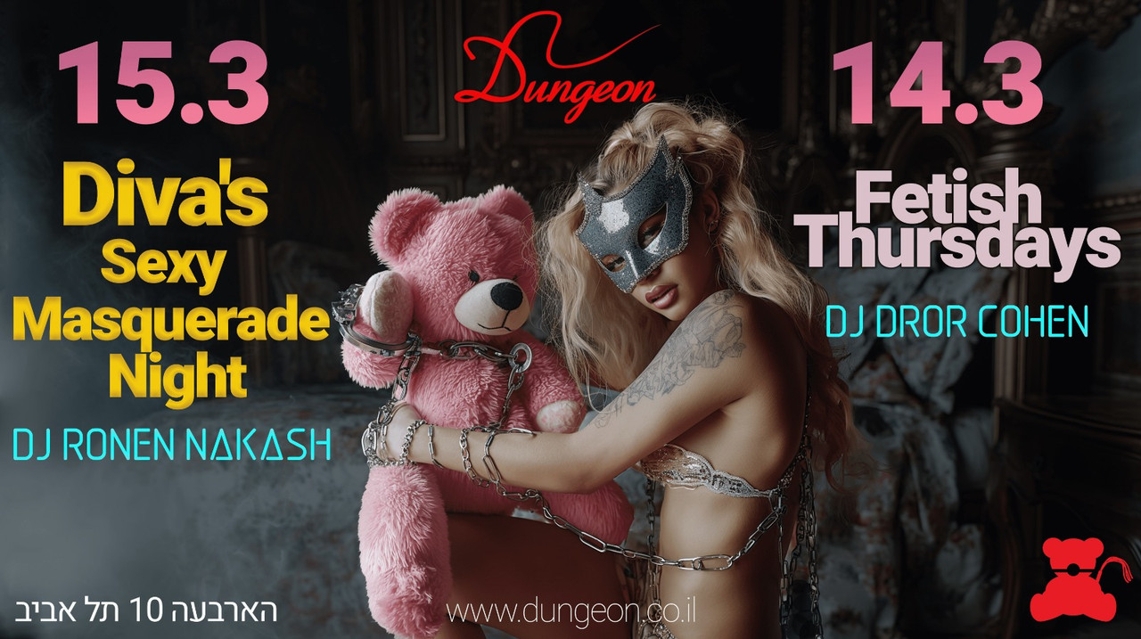חמישי 14.3 פתיחה בשעה 23:30 Fetish Thursdays Dj Dror Cohen פותחים את הסופ"ש בסערה עם ערב הדגל של המועדון כבר למעלה מ-21 שנה מארחים את ניקה על עמוד הריקודים המופע המרכזי על הבמה - קימברלי גראנד, המלכה הבלתי מעורערת של הדאנג'ן, במופע סוער ורב משתתפים צוות הפרפורמרים שלנו על הבמה, עמוד הריקודים והחישוק לאורך הלילה כולו לרכישת כרטיסים במכירה מוקדמת עד חמישי בשעה 22:00 (כרטיס זוגי באיזון מגדרי בלבד, המחיר בקופה יקר יותר): https://dungeon.co.il/product/fetish-thursdays-14-3/ שישי 15.3 פתיחה בחצות Diva's Sexy Masquerade Night Dj Ronen Nakash 🦹♂️🦹♀️שישי הקרוב בליין של דיווה מוציאים את השמלות והחליפות מהארון נשף מסיכות סקסי מי מסתתר מאחורי המסכה שלכם? אתם רוצים לגלות או רק להיות?😈 🌹חוגגים יום הולדת בפעם הראשונה לנאנו הבלונדינית הסודית. במהלך הלילה יחולקו מסיכות סקסיות על הבמה - לירון vs אנה בפעם הראשונה ביחד בהופעת עיניים עצומות לרווחה עמדת אימפקט סקסית, עמדת שעווה לוהטת לרכישת כרטיסים במכירה מוקדמת עד שישי בשעה 22:00 (כרטיס זוגי באיזון מגדרי בלבד, המחיר בקופה יקר יותר): https://dungeon.co.il/product/divas-sexy-masquerade-night-15-3/ החנות החדשה והמטריפה שלנו פתוחה! The Dungeon Concept Shop הכניסה למסיבות מגיל 18 ומעלה ובדרס קוד בלבד: כל מה שקינקי ופטישיסטי, מינימום לבוש שחור מלא ובלי ג’ינס כחול. יש להגיע עם תעודת זהות/רישיון נהיגה (לא צילום בטלפון). יש להישמע להוראות המאבטחים ואנשי הצוות בכניסה ובמקום עצמו. מתחם המבוך החדש, המוגדל והמשודרג המפורסם בכל העיר. הכניסה למתחם המבוך לזוגות בלבד. הצילום בכל רחבי המועדון אסור בהחלט! הדאנג’ן – הבית לחובבי הפטיש קינק והסאדו מאזו בישראל מאז 2002, אז תנסו את זה בבית. מוזמנים לעקוב אחרינו גם באינסטגרם ובטלגרם https://www.instagram.com/dungeon_tlv --telegram-- בשביל מיינסטרים יש מקומות אחרים הארבעה 10 | תל אביב יש חניון שעומד לרשותכם, חניון גבעון – במחיר מסובסד של 15 ש”ח לכל הלילה. מחתימים את הכרטיס בקופת הדאנג’ן