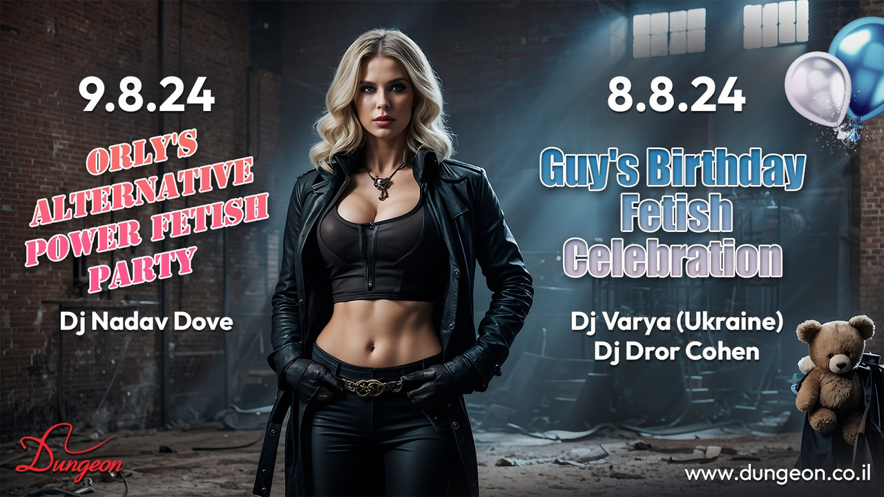 חמישי 8.8 פתיחה בשעה 23:30 Guy's Birthday Fetish Celebration Dj Varya (Ukraine) Dj Dror Cohen חוגגים יום הולדת לגיא, מנהל המועדון, במסיבה הכי לוהטת בעיר, עם המון הופעות והפתעות לאורך הלילה כולו. מספר המקומות מוגבל! במסיבה זו לא נוכל להתחייב להכניס את מי שלא יקנה כרטיסים מראש במכירה המוקדמת. המחיר בקופה יהיה יקר מהרגיל ועל בסיס מקום פנוי בלבד. מה בתכנית? * מופע שיבארי מרהיב של Moriya * בתשי - אלופת ישראל בריקוד על עמוד שלוש שנים ברציפות * מופע MaleDom עוצר נשימה כתמיד של גברת אופניק וניר * על העמדה – Dj Varya מאוקראינה מגיעה לתת בראש עם סט מלודיק טכנו חגיגי. יפתח ויסגור הרזידנט התותח שלנו די.ג'יי דרור כהן * עמדת פירסינג בכלוב הקטן * צוות הפרפורמרים שלנו בהרכב מורחב – רועי בעל הנס, יסמין, ספיר, מיכל, טופז, לירון, משי וליאל – במופעי פטיש ו-BDSM על הבמה, עמוד הריקודים, המנוף והחישוק לאורך הלילה כולו * מגשי אוכל, נשנושים וקינוחים מתוקים יוגשו במהלך המסיבה להנאת הבליינים לרכישת כרטיסים במכירה מוקדמת עד חמישי בשעה 22:00 (כרטיס זוגי באיזון מגדרי בלבד, המחיר בקופה יקר יותר): https://dungeon.co.il/product/guys-birthday-fetish-celebration-8-8/ שישי 9.8 פתיחה בחצות Orly's Alternative Power Fetish Party Dj Nadav Dove שישי אלטרנטיבי משחרר במיוחד הפנטזיה האלטרנטיבית, החופש להיות מי שאנחנו רוצים. נפגשים להתפרק ולהשתחרר במסיבת זימה פטישיסטית ומושחתת בגרסה סקסית אפלה וכואבת במיוחד. משחקים קינקיים והופעות פטיש כל הלילה ההופעה המרכזית - לירון ותולי במופע עתידני מרהיב וכואב שלא מהעולם הזה לרכישת כרטיסים במכירה מוקדמת עד שישי בשעה 22:00 (כרטיס זוגי באיזון מגדרי בלבד, המחיר בקופה יקר יותר): https://dungeon.co.il/product/orlys-alternative-power-fetish-party-9-8/ החנות החדשה והמטריפה שלנו פתוחה! The Dungeon Concept Shop הכניסה למסיבות מגיל 18 ומעלה ובדרס קוד בלבד: כל מה שקינקי ופטישיסטי, מינימום לבוש שחור מלא ובלי ג’ינס כחול. יש להגיע עם תעודת זהות/רישיון נהיגה (לא צילום בטלפון). יש להישמע להוראות המאבטחים ואנשי הצוות בכניסה ובמקום עצמו. מתחם המבוך החדש, המוגדל והמשודרג המפורסם בכל העיר. הכניסה למתחם המבוך לזוגות בלבד. הצילום בכל רחבי המועדון אסור בהחלט! הדאנג’ן – הבית לחובבי הפטיש קינק והסאדו מאזו בישראל מאז 2002, אז תנסו את זה בבית. מוזמנים לעקוב אחרינו גם באינסטגרם ובטלגרם https://www.instagram.com/dungeon_tlv --telegram-- בשביל מיינסטרים יש מקומות אחרים הארבעה 10 | תל אביב יש חניון שעומד לרשותכם, חניון גבעון – במחיר מסובסד של 15 ש”ח לכל הלילה. מחתימים את הכרטיס בקופת הדאנג’ן