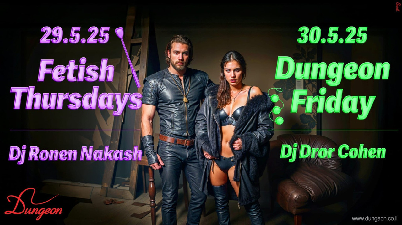 חמישי 29.5 פתיחה בשעה 23:30 Fetish Thursdays Dj Ronen Nakash פותחים את הסופ"ש בסערה עם ערב הדגל של המועדון כבר 22 שנים חוגגים יום הולדת למלכה האהובה שלנו ❤️ בניגוד לאחרים, היא ממש מחכה כבר ל"חוק זה חוק" של קימברלי אריאלה בהופעת בכורה על עמוד הריקודים ההופעה המרכזית - יולי אדום במופע פמדום לוהט צוות הפרפורמרים שלנו על הבמה, עמוד הריקודים, המנוף והחישוק לאורך הלילה כולו לרכישת כרטיסים במכירה מוקדמת עד חמישי בשעה 22:00 (כרטיס זוגי באיזון מגדרי בלבד, המחיר בקופה יקר יותר): https://dungeon.co.il/product/fetish-thursdays-29-5/ שישי 30.5 פתיחה בחצות Dungeon Friday Theatre Of Desire Fetish Party Dj Dror Cohen לילה שבו התשוקה עולה לבמה המסך נפתח, התאורה בוערת, הדמויות כבר לא מסתתרות מאחורי מסכות הקהל הא השחקן מופע שיבארי של Or & Precious Minded פינק ג'ינג'ר על עמוד הריקודים ההופעה המרכזית על הבמה - ניר וגברת אופניק במופע חד-פעמי בשילוב הקהל לרכישת כרטיסים במכירה מוקדמת עד שישי בשעה 22:00 (כרטיס זוגי באיזון מגדרי בלבד, המחיר בקופה יקר יותר): https://dungeon.co.il/product/dungeon-friday-theatre-of-desire-fetish-party-30-5/ חנות הקונספט המטריפה שלנו פתוחה! The Dungeon Concept Shop הכניסה למסיבות מגיל 18 ומעלה ובדרס קוד בלבד: כל מה שקינקי ופטישיסטי, מינימום לבוש שחור מלא ובלי ג’ינס כחול. יש להגיע עם תעודת זהות/רישיון נהיגה (לא צילום בטלפון). יש להישמע להוראות המאבטחים ואנשי הצוות בכניסה ובמקום עצמו. מתחם המבוך המוגדל והמשודרג המפורסם בכל העיר. הכניסה למתחם המבוך לזוגות בלבד. הצילום בכל רחבי המועדון אסור בהחלט! הדאנג’ן – הבית לחובבי הפטיש קינק והסאדו מאזו בישראל מאז 2002, אז תנסו את זה בבית. בשביל מיינסטרים יש מקומות אחרים הארבעה 10 | תל אביב יש חניון שעומד לרשותכם, חניון גבעון – במחיר מסובסד של 15 ש”ח לכל הלילה. מחתימים את הכרטיס בקופת הדאנג’ן