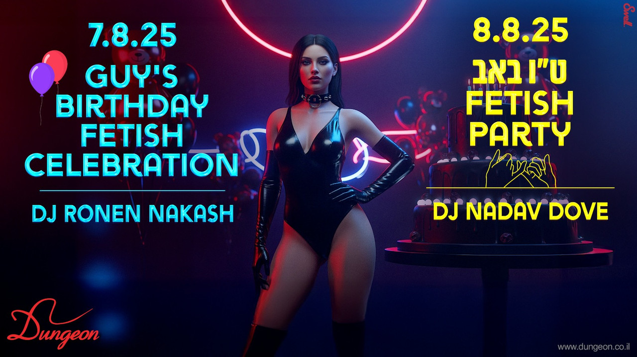 חמישי 7.8 פתיחה בשעה 23:30 Guy's Birthday Fetish Celebration Dj Ronen Nakash חוגגים יום הולדת לגיא, מנהל המועדון, במסיבה הכי לוהטת בעיר, עם המון הופעות והפתעות לאורך הלילה כולו. מספר המקומות מוגבל! במסיבה זו לא נוכל להתחייב להכניס את מי שלא יקנה כרטיסים מראש במכירה המוקדמת. המחיר בקופה יהיה יקר מהרגיל ועל בסיס מקום פנוי בלבד. מה בתכנית? * מופע שיבארי מרהיב של Or & Precious Minded * ג'וליאן ההורס ופינק ג'ינג'ר המהפנטת על עמוד הריקודים * מופע FemDom ו-MaleDom משולב של יולי אדום ורז, שישתפו פעולה בפעם הראשונה על הבמה * על העמדה – הרזידנט התותח שלנו די.ג'יי רונן נקש בסט מגוון וחגיגי * צוות הפרפורמרים שלנו בהרכב מורחב במופעי פטיש ו-BDSM על הבמה, עמוד הריקודים, המנוף והחישוק לאורך הלילה כולו * מגשי אוכל, נשנושים וקינוחים מתוקים יוגשו במהלך המסיבה להנאת הבליינים לרכישת כרטיסים במכירה מוקדמת עד חמישי בשעה 22:00 (כרטיס זוגי באיזון מגדרי בלבד, המחיר בקופה יקר יותר): https://dungeon.co.il/product/guys-birthday-fetish-celebration-7-8/ שישי 8.8 פתיחה בחצות ט"ו באב Fetish Party Dj Nadav Dove עושים אהבה כמו שרק אנחנו יודעים תפאורה רומנטית ופינוקי שוקולד לבביים בדרס קוד הפעם אפשר להגיע גם באדום או משולב אדום ושחור מופעים של רותם אקרובטית העל ושל בתשי על עמוד הריקודים הסשן המרכזי על הבמה - לירון פותחת את שערי גן החיות עם תולי וצ'ין צ'ין לרכישת כרטיסים במכירה מוקדמת עד שישי בשעה 22:00 (כרטיס זוגי באיזון מגדרי בלבד, המחיר בקופה יקר יותר): https://dungeon.co.il/product/tu-be-av-fetish-party-8-8/ חנות הקונספט המטריפה שלנו פתוחה! The Dungeon Concept Shop הכניסה למסיבות מגיל 18 ומעלה ובדרס קוד בלבד: כל מה שקינקי ופטישיסטי, מינימום לבוש שחור מלא ובלי ג’ינס כחול. יש להגיע עם תעודת זהות/רישיון נהיגה (לא צילום בטלפון). יש להישמע להוראות המאבטחים ואנשי הצוות בכניסה ובמקום עצמו. מתחם המבוך המוגדל והמשודרג המפורסם בכל העיר. הכניסה למתחם המבוך לזוגות בלבד. הצילום בכל רחבי המועדון אסור בהחלט! הדאנג’ן – הבית לחובבי הפטיש קינק והסאדו מאזו בישראל מאז 2002, אז תנסו את זה בבית. בשביל מיינסטרים יש מקומות אחרים הארבעה 10 | תל אביב יש חניון שעומד לרשותכם, חניון גבעון – במחיר מסובסד של 15 ש”ח לכל הלילה. מחתימים את הכרטיס בקופת הדאנג’ן