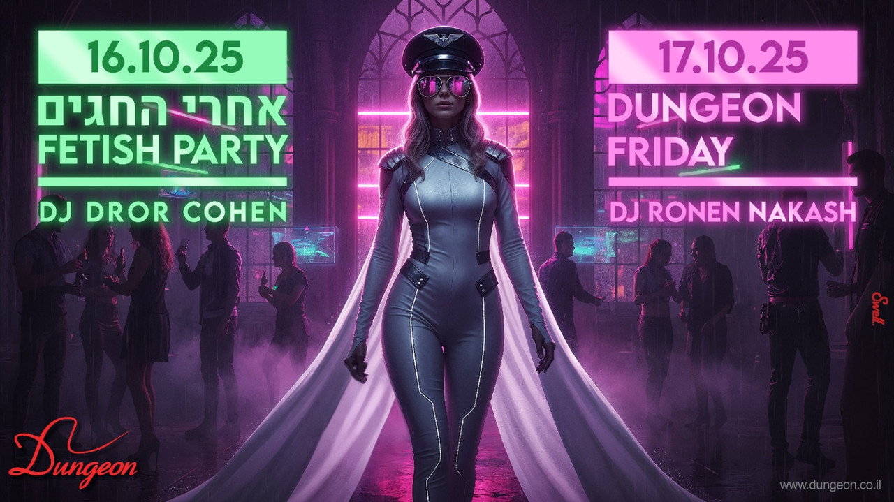 חמישי 16.10 פתיחה בשעה 23:30 After The Holidays Fetish Party Dj Dror Cohen "אחרי החגים" הגיע, ואנחנו כאן כדי לעזור לכם לחזור לשגרה בדרך הכי נעימה (וכואבת) שיש מיכל וג'וליאן על עמוד הריקודים המופע המרכזי על הבמה - Goddess Seilor Kitty והכלבלב שלה צוות הפרפורמרים שלנו על הבמה, עמוד הריקודים, המנוף והחישוק לאורך הלילה כולו לרכישת כרטיסים במכירה מוקדמת עד חמישי בשעה 22:00 (כרטיס זוגי באיזון מגדרי בלבד, המחיר בקופה יקר יותר): https://dungeon.co.il/product/after-the-holidays-fetish-party-16-10/ שישי 17.10 פתיחה בחצות Dungeon Friday Dj Ronen Nakash נפגשים להתפרק ולהשתחרר במסיבת זימה מושחתת בגרסה כואבת, סקסית ואפלה במיוחד על הבמה משחקים קינקיים והופעות פטיש כל הלילה ג'וליאן ההורס על עמוד הריקודים המופע המרכזי - לירון וצ'ין צ'ין בהופעה לוהטת 🔥 לרכישת כרטיסים במכירה מוקדמת עד שישי בשעה 22:00 (כרטיס זוגי באיזון מגדרי בלבד, המחיר בקופה יקר יותר): https://dungeon.co.il/product/dungeon-friday-17-10/ חנות הקונספט המטריפה שלנו פתוחה! The Dungeon Concept Shop הכניסה למסיבות מגיל 18 ומעלה ובדרס קוד בלבד: כל מה שקינקי ופטישיסטי, מינימום לבוש שחור מלא ובלי ג’ינס כחול. יש להגיע עם תעודת זהות/רישיון נהיגה (לא צילום בטלפון). יש להישמע להוראות המאבטחים ואנשי הצוות בכניסה ובמקום עצמו. מתחם המבוך המוגדל והמשודרג המפורסם בכל העיר. הכניסה למתחם המבוך לזוגות בלבד. הצילום בכל רחבי המועדון אסור בהחלט! הדאנג’ן – הבית לחובבי הפטיש קינק והסאדו מאזו בישראל מאז 2002, אז תנסו את זה בבית. בשביל מיינסטרים יש מקומות אחרים הארבעה 10 | תל אביב יש חניון שעומד לרשותכם, חניון גבעון – במחיר מסובסד של 15 ש”ח לכל הלילה. מחתימים את הכרטיס בקופת הדאנג’ן