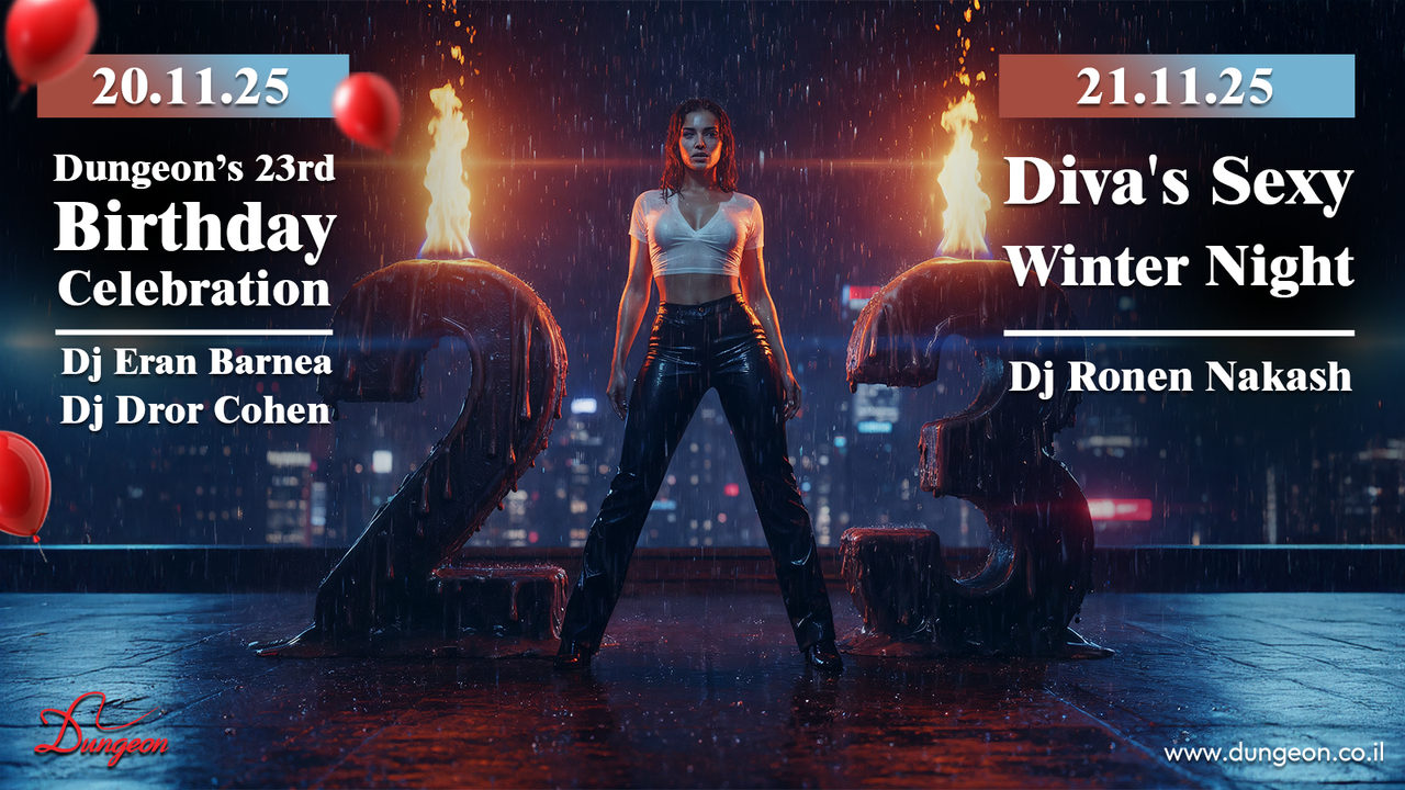 חמישי 20.11 פתיחה בשעה 23:30 Dungeon’s 23rd Birthday Celebration - Michal Amdursky's Live Show Dj Eran Barnea Dj Dror Cohen אנחנו שמחים ונרגשים להזמין את כולכם לחגוג איתנו 23 שנים נפלאות של עשייה ומסיבות בלתי נשכחות המועדון הכי אפל והכי ותיק בתל אביב חוגג יום הולדת 23 במסיבה שכולם יהיו בה ושיהיה בה הכל: * כל מי שחוגג יחד עם המועדון יום הולדת 23 במהלך חודש נובמבר יקבל מאיתנו צ'ייסר מתנה (בהצגת ת.ז. בקופה) * מיכל אמדורסקי האחת והיחידה מגיעה למופע פריצה בשיאה של המסיבה * מארחים לראשונה אצלנו את די.ג'יי ערן ברנע לסט חגיגי. הרזידנט שלנו די.ג'יי דרור כהן יפתח ויסגור. * מופע שיבארי (אמנות קשירות יפנית) של אמנית השיבארי הבינלאומית Goldie Sunshine ובן זוגה סטאר * מופע תלייה מהשיער עוצר נשימה של רותם, אקרובטית העל ואמנית הקרקס * אלופת ישראל בריקוד אקזוטי על עמוד * הסשן המרכזי על הבמה – רז, יולי אדום ודושי במשולש מסוכן * כיבוד חופשי מגוון, מלוח ומתוק, יוגש במהלך המסיבה מספר המקומות מוגבל! הבטיחו את מקומכם במסיבה הגדולה והשמחה של השנה ורכשו כרטיסים מראש במכירה המוקדמת (עד ערב המסיבה בשעה 22:00). המחיר בקופה יהיה יקר יותר מהרגיל ועל בסיס מקום פנוי בלבד 👇 https://dungeon.co.il/product/dungeons-23rd-birthday-celebration-hosting-dj-eran-barnea-20-11/ שישי 21.11 פתיחה בחצות Diva's Sexy Winter Night Dj Ronen Nakash השבוע בליין של דיווה כובשים את המועדון בסערה 🌪️ פינוקי קרמבו מפנקים ועוד ☔שלושת הנשים הראשונות שתגענה עם מעיל ומתחת הלבשה תחתונה תיכנסנה ללא תשלום. המגזימה ביותר תזכה בכניסה זוגית מתנה ליום ההולדת של הדיווה ב-19.12☔ 💥 על הבמה המרכזית יולי אדום תראה לעידו איך שוברים את הקרח 💥 פינק ג'ינג'ר היפה תכבוש את עמוד הריקודים בסערה 💥 ג'וליאן ההורס ירטיב את המועדון 💥 על העמדה הרזידנט שלנו די.ג'יי נקש בסט מוריד הגשם לרכישת כרטיסים במכירה מוקדמת עד שישי בשעה 22:00 (כרטיס זוגי באיזון מגדרי בלבד, המחיר בקופה יקר יותר): https://dungeon.co.il/product/divas-sexy-winter-night-21-11/ חנות הקונספט המטריפה שלנו פתוחה! The Dungeon Concept Shop הכניסה למסיבות מגיל 18 ומעלה ובדרס קוד בלבד: כל מה שקינקי ופטישיסטי, מינימום לבוש שחור מלא ובלי ג’ינס כחול. יש להגיע עם תעודת זהות/רישיון נהיגה (לא צילום בטלפון). יש להישמע להוראות המאבטחים ואנשי הצוות בכניסה ובמקום עצמו. מתחם המבוך המוגדל והמשודרג המפורסם בכל העיר. הכניסה למתחם המבוך לזוגות בלבד. הצילום בכל רחבי המועדון אסור בהחלט! הדאנג’ן – הבית לחובבי הפטיש קינק והסאדו מאזו בישראל מאז 2002, אז תנסו את זה בבית. בשביל מיינסטרים יש מקומות אחרים הארבעה 10 | תל אביב יש חניון שעומד לרשותכם, חניון גבעון – במחיר מסובסד של 15 ש”ח לכל הלילה. מחתימים את הכרטיס בקופת הדאנג’ן