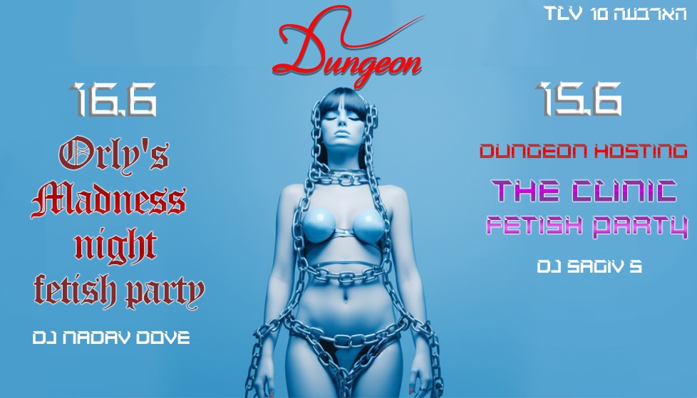 חמישי 15.6 פתיחה בשעה 23:30 Dungeon hosting The Clinic Fetish Party Dj Sagiv S. המסיבה החודשית המשותפת של הדאנג'ן עם ליין הקליניקה בכל העיר כבר יודעים איפה נמצאים פעם בחודש כל האנשים הנכונים החנות החדשה שלנו פתוחה! The Dungeon Shop - עשרות מוצרים בהנחות של עד 50% לרגל הפתיחה http://gtoy.co.il/ מופעים ללא הפסקה על הבמה, על עמוד הריקודים ועל החישוק של צוותי הפרפורמרים של הדאנג'ן ושל הקליניקה לרכישת כרטיסים במכירה מוקדמת עד חמישי בשעה 22:00 (כרטיס זוגי באיזון מגדרי בלבד, המחיר בקופה יקר יותר): https://dungeon.co.il/events/dungeon-hosting-the-clinic-fetish-party-15-6/ שישי 16.6 פתיחה בחצות Orly's Madness Night Fetish Party Dj Nadav Dove כשהשעון מורה חצות, זה הזמן לבוא ולהנות שישי מטורף, אנחנו נראים לכם שפויים? Come and get crazy with us כאן זה המקום בו יש את החופש להיות מי ומה שאנחנו רוצים להיות על הבמה משחקים קינקיים והופעות פטיש כל הלילה ההופעה המרכזית - קימברלי גראנד האחת והיחידה, קחו אוויר לרכישת כרטיסים במכירה מוקדמת עד שישי בשעה 22:00 (כרטיס זוגי באיזון מגדרי בלבד, המחיר בקופה יקר יותר): https://dungeon.co.il/events/orlys-madness-night-fetish-party-16-6/ הכניסה למסיבות מגיל 18 ומעלה ובדרס קוד בלבד: כל מה שקינקי ופטישיסטי, מינימום לבוש שחור מלא ובלי ג'ינס כחול. יש להגיע עם תעודת זהות/רישיון נהיגה (לא צילום בטלפון). יש להישמע להוראות המאבטחים ואנשי הצוות בכניסה ובמקום עצמו. מתחם המבוך החדש, המוגדל והמשודרג המפורסם בכל העיר. הכניסה למתחם המבוך לזוגות בלבד. הצילום בכל רחבי המועדון אסור בהחלט! הדאנג’ן – הבית לחובבי הפטיש קינק והסאדו מאזו בישראל מאז 2002, אז תנסו את זה בבית. מוזמנים לעקוב אחרינו גם באינסטגרם ובטלגרם https://www.instagram.com/dungeon_tlv --telegram-- בשביל מיינסטרים יש מקומות אחרים הארבעה 10 | תל אביב יש חניון שעומד לרשותכם, חניון גבעון – במחיר מסובסד של 10 ש"ח לכל הלילה. מחתימים את הכרטיס בקופת הדאנג'ן