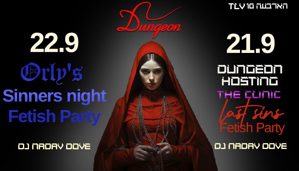 חמישי 21.9 פתיחה בשעה 23:30 Dungeon hosting The Clinic Last Sins Fetish Party Dj Nadav Dove המסיבה החודשית המשותפת של הדאנג'ן עם ליין הקליניקה בכל העיר כבר יודעים איפה נמצאים פעם בחודש כל האנשים הנכונים המופע המרכזי על הבמה - קטיה ואדיר לרכישת כרטיסים במכירה מוקדמת עד חמישי בשעה 22:00 (כרטיס זוגי באיזון מגדרי בלבד, המחיר בקופה יקר יותר): https://dungeon.co.il/events/dungeon-hosting-the-clinic-last-sins-fetish-party-21-9/ שישי 22.9 פתיחה בחצות Orly's Sinners Night Fetish Party Dj Nadav Dove קצת לפני כיפור, הזדמנות אחרונה לצבור עוד כמה חטאים המסיבה שתספק לכם את כל הסיבות לצום מסיבת נזירות וכמרים סקסית במיוחד לתשומת לבכם, שלושת המתחפשים הראשונים לנזירות או כמרים יזכו בכניסה חינם באהבה מאיתנו חוגגים יום הולדת שמח לדי ג'יי שלנו Nadav Dove ולסטיב האהוב על הבמה משחקים קינקיים והופעות פטיש מיוחדות למסיבה לרכישת כרטיסים במכירה מוקדמת עד שישי בשעה 22:00 (כרטיס זוגי באיזון מגדרי בלבד, המחיר בקופה יקר יותר): https://dungeon.co.il/events/orlys-sinners-night-fetish-party-22-9/ החנות החדשה שלנו פתוחה במהלך המסיבות! The Dungeon Shop - עשרות מוצרים בהנחות לרגל הפתיחה http://gtoy.co.il/ הכניסה למסיבות מגיל 18 ומעלה ובדרס קוד בלבד: כל מה שקינקי ופטישיסטי, מינימום לבוש שחור מלא ובלי ג'ינס כחול. יש להגיע עם תעודת זהות/רישיון נהיגה (לא צילום בטלפון). יש להישמע להוראות המאבטחים ואנשי הצוות בכניסה ובמקום עצמו. מתחם המבוך החדש, המוגדל והמשודרג המפורסם בכל העיר. הכניסה למתחם המבוך לזוגות בלבד. הצילום בכל רחבי המועדון אסור בהחלט! הדאנג’ן – הבית לחובבי הפטיש קינק והסאדו מאזו בישראל מאז 2002, אז תנסו את זה בבית. מוזמנים לעקוב אחרינו גם באינסטגרם ובטלגרם https://www.instagram.com/dungeon_tlv --telegram-- בשביל מיינסטרים יש מקומות אחרים הארבעה 10 | תל אביב יש חניון שעומד לרשותכם, חניון גבעון – במחיר מסובסד של 15 ש"ח לכל הלילה. מחתימים את הכרטיס בקופת הדאנג'ן