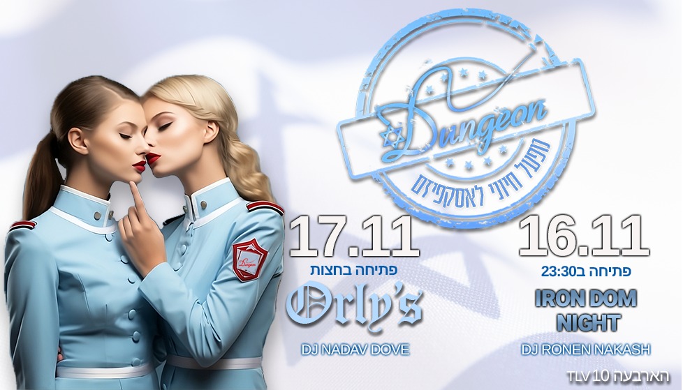 חמישי 16.11 פתיחה בשעה 23:30 Iron Dom Fetish Party Dj Ronen Nakash המקום המושלם לברוח אליו לכמה שעות ממציאות חיינו המטורפת צוות הפרפורמרים שלנו על הבמה, עמוד הריקודים והחישוק לאורך הלילה כולו לרכישת כרטיסים במכירה מוקדמת עד חמישי בשעה 22:00 (כרטיס זוגי באיזון מגדרי בלבד, המחיר בקופה יקר יותר): https://dungeon.co.il/product/iron-dom-fetish-party-16-11/ שישי 17.11 פתיחה בחצות Orly’s Fetish Party Dj Nadav Dove חוגגים יום הולדת לענבל האהובה שלנו <3 ההופעה המרכזית על הבמה: קימברלי גראנד, המלכה הבלתי מעורערת של הדאנג’ן לרכישת כרטיסים במכירה מוקדמת עד שישי בשעה 22:00 (כרטיס זוגי באיזון מגדרי בלבד, המחיר בקופה יקר יותר): https://dungeon.co.il/product/orlys-fetish-party-17-11/ מרחב מוגן – המועדון עצמו נמצא במרתף מתחת לאדמה. קומת המבוך היא המקלט של הבניין. החנות החדשה שלנו פתוחה במהלך המסיבות! The Dungeon Shop – http://gtoy.co.il/ הכניסה למסיבות מגיל 18 ומעלה ובדרס קוד בלבד: כל מה שקינקי ופטישיסטי, מינימום לבוש שחור מלא ובלי ג’ינס כחול. יש להגיע עם תעודת זהות/רישיון נהיגה (לא צילום בטלפון). יש להישמע להוראות המאבטחים ואנשי הצוות בכניסה ובמקום עצמו. מתחם המבוך החדש, המוגדל והמשודרג המפורסם בכל העיר. הכניסה למתחם המבוך לזוגות בלבד. הצילום בכל רחבי המועדון אסור בהחלט! הדאנג’ן – הבית לחובבי הפטיש קינק והסאדו מאזו בישראל מאז 2002, אז תנסו את זה בבית. מוזמנים לעקוב אחרינו גם באינסטגרם ובטלגרם https://www.instagram.com/dungeon_tlv --telegram-- בשביל מיינסטרים יש מקומות אחרים הארבעה 10 | תל אביב יש חניון שעומד לרשותכם, חניון גבעון – במחיר מסובסד של 15 ש”ח לכל הלילה. מחתימים את הכרטיס בקופת הדאנג’ן נעבור את זה ביחד ❤️