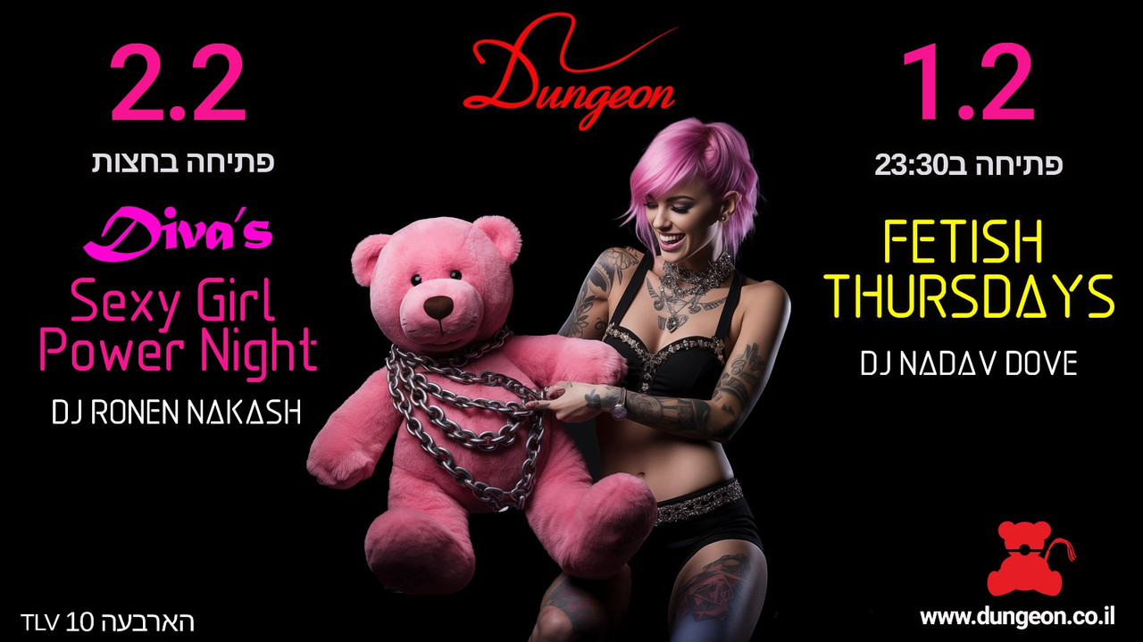 חמישי 1.2 פתיחה בשעה 23:30 Fetish Thursdays Dj Nadav Dove פותחים את הסופ"ש בסערה עם ערב הדגל של המועדון כבר למעלה מ-21 שנה המופע המרכזי על הבמה - רועי בעל הנס והבנות צוות הפרפורמרים שלנו על הבמה, עמוד הריקודים והחישוק לאורך הלילה כולו לרכישת כרטיסים במכירה מוקדמת עד חמישי בשעה 22:00 (כרטיס זוגי באיזון מגדרי בלבד, המחיר בקופה יקר יותר): https://dungeon.co.il/product/fetish-thursdays-1-2/ שישי 2.2 פתיחה בחצות Diva's Sexy Girl Power Night Dj Ronen Nakash השבוע בקינקליין סלון לילה בסימן נשי חוגגים יומולדת לחברת הליין qu y na שימו💕 הפעם בדרס קוד מותר ורצוי גם ורוד גם הפינוקים שלנו בורוד 😈הלילה הזה כולו בסימן נשיות חזקה בלייב פולינה ודוֹש במופע מיוחד המשלב ריקוד על עמוד ונגינה בגיטרה בלייב ניראל במשחק מסוכן עם הודיה, הן הולכות לשרוף את הבמה לירון משליטה סדר בארמון תחרות מדידת העקב הכי גבוה עם פרסים מגניבים 🌹החלטנו לפנק את הנשים בביוטי און ליין https://www.facebook.com/profile.php?id=61551887350173&mibextid=LQQJ4d מילוי/עיבוי שפתיים בעט היאלורונית במחיר מיוחד לבלייני הדאנג'ן, רק 350 שקלים לטיפול 🌹 נשים בלבד כל פברואר הנחה של 10% אצל המקעקעת ליהי https://www.instagram.com/lihi_menzone_tattoo?igsh=d2ptY2R1MmNxZGFp פינת שעווה, פינת מדיקל ופינת אל תנסו את זה בבית לרכישת כרטיסים במכירה מוקדמת עד שישי בשעה 22:00 (כרטיס זוגי באיזון מגדרי בלבד, המחיר בקופה יקר יותר): https://dungeon.co.il/product/divas-sexy-girl-power-night-2-2/ החנות החדשה והמטריפה שלנו פתוחה! The Dungeon Concept Shop הכניסה למסיבות מגיל 18 ומעלה ובדרס קוד בלבד: כל מה שקינקי ופטישיסטי, מינימום לבוש שחור מלא ובלי ג’ינס כחול. יש להגיע עם תעודת זהות/רישיון נהיגה (לא צילום בטלפון). יש להישמע להוראות המאבטחים ואנשי הצוות בכניסה ובמקום עצמו. מתחם המבוך החדש, המוגדל והמשודרג המפורסם בכל העיר. הכניסה למתחם המבוך לזוגות בלבד. הצילום בכל רחבי המועדון אסור בהחלט! הדאנג’ן – הבית לחובבי הפטיש קינק והסאדו מאזו בישראל מאז 2002, אז תנסו את זה בבית. מוזמנים לעקוב אחרינו גם באינסטגרם ובטלגרם https://www.instagram.com/dungeon_tlv --telegram-- בשביל מיינסטרים יש מקומות אחרים הארבעה 10 | תל אביב יש חניון שעומד לרשותכם, חניון גבעון – במחיר מסובסד של 15 ש”ח לכל הלילה. מחתימים את הכרטיס בקופת הדאנג’ן