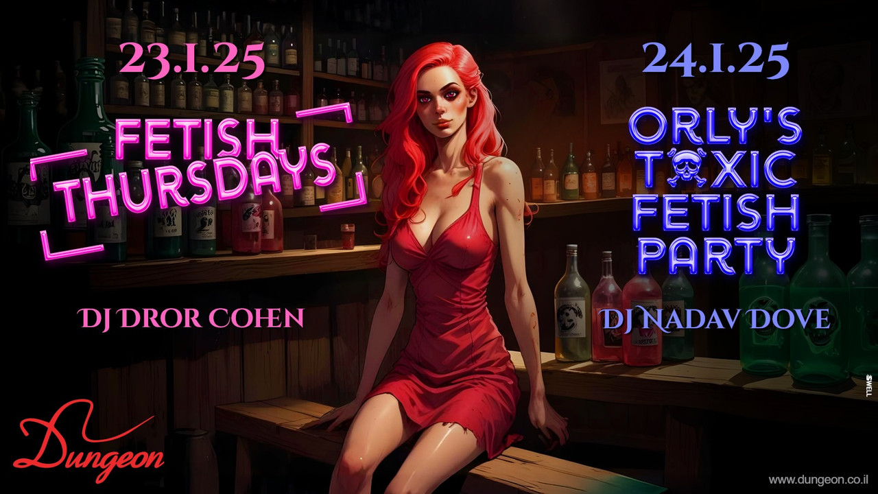 ** המועדון עובר במהלך השבוע שיפוץ והתחדשות של הרחבה המרכזית. בואו בסופ"ש לראות את התוצאות ** חמישי 23.1 פתיחה בשעה 23:30 Fetish Thursdays Dj Nadav Dove פותחים את הסופ"ש בסערה עם ערב הדגל של המועדון כבר 22 שנים חוגגים שנה לחנות הקונספט שלנו במועדון! אחרי שנה מלאה באופנה (פטישיסטית), סטייל (מלא בשוטים וקולרים) וחדשנות (עמוסה בספלים ממותגים), נחגוג את הדרך שעשינו ביחד אתכם באירוע שיכלול תצוגת אופנה מרהיבה, בה תראו את כל הטרנדים החדשים, לצד הנחות והפתעות שוות במיוחד! עמדת פירסינג וקעקועים בכלוב הקטן חגיגה בלתי נגמרת של פרפורמרים והופעות על הבמה, עמוד הריקודים, המנוף והחישוק לאורך הלילה כולו ג'וליאן ההורס על עמוד הריקודים סשה ועמרי בהופעת בכורה על הבמה ההופעה המרכזית - יולי אדום ולאורה בסשן מלא בתשוקה וכאב לרכישת כרטיסים במכירה מוקדמת עד חמישי בשעה 22:00 (כרטיס זוגי באיזון מגדרי בלבד, המחיר בקופה יקר יותר): https://dungeon.co.il/product/fetish-thursdays-23-1/ שישי 24.1 פתיחה בחצות Orly's Toxic Fetish Party Dj Dror Cohen נפגשים ללילה מלא בקסם רעיל פטישיסטי שובב ושמח תאורה אפלולית מיוחדת ואווירה סקסית מוזיקה מצוינת והכי חשוב הרבה אהבה על הבמה משחקים קינקיים והופעות פטיש כל הלילה טופז המהפנטת על עמוד הריקודים ההופעה המרכזית - לירון ושני בהופעה ממכרת שלא תוכלו להוריד ממנה את העיניים לרכישת כרטיסים במכירה מוקדמת עד שישי בשעה 22:00 (כרטיס זוגי באיזון מגדרי בלבד, המחיר בקופה יקר יותר): https://dungeon.co.il/product/orlys-toxic-fetish-party-24-1/ חנות הקונספט המטריפה שלנו פתוחה! The Dungeon Concept Shop הכניסה למסיבות מגיל 18 ומעלה ובדרס קוד בלבד: כל מה שקינקי ופטישיסטי, מינימום לבוש שחור מלא ובלי ג’ינס כחול. יש להגיע עם תעודת זהות/רישיון נהיגה (לא צילום בטלפון). יש להישמע להוראות המאבטחים ואנשי הצוות בכניסה ובמקום עצמו. מתחם המבוך החדש, המוגדל והמשודרג המפורסם בכל העיר. הכניסה למתחם המבוך לזוגות בלבד. הצילום בכל רחבי המועדון אסור בהחלט! הדאנג’ן – הבית לחובבי הפטיש קינק והסאדו מאזו בישראל מאז 2002, אז תנסו את זה בבית. בשביל מיינסטרים יש מקומות אחרים הארבעה 10 | תל אביב יש חניון שעומד לרשותכם, חניון גבעון – במחיר מסובסד של 15 ש”ח לכל הלילה. מחתימים את הכרטיס בקופת הדאנג’ן