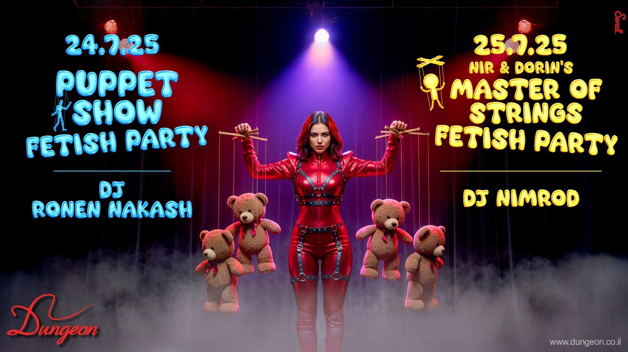 חמישי 24.7 פתיחה בשעה 23:30 Puppet Show Fetish Party Dj Ronen Nakash מסיבת תיאטרון בובות יוצאת דופן, עם תפאורה מיוחדת והופעות מפתיעות לילה של פנטזיה, דמיון, מוזיקה ובובות מכל הסוגים 💃 קוד לבוש: בובתי ככל האפשר – ברבי, קן, פאוורפאף, צ'אקי, בובת ראווה, או גרסה בובתית של עצמך! מי שישקיע במיוחד יזכה בפרס. מופע עוצר נשימה של רותם אקרובטית העל פינק ג'ינג'ר ואריאלה על עמוד הריקודים המופע המרכזי על הבמה - לירון וצ'ין צ'ין בבובה של הופעה לרכישת כרטיסים במכירה מוקדמת עד חמישי בשעה 22:00 (כרטיס זוגי באיזון מגדרי בלבד, המחיר בקופה יקר יותר): https://dungeon.co.il/product/puppet-show-fetish-party-24-7/ שישי 25.7 פתיחה בחצות Nir & Dorin's Master Of Strings Fetish Party Dj Nimrod 🎭 תיאטרון התשוקה של ניר ודורין מציג: 🎩Master of Strings🎩 בואו להיסחף אל תוך עולם שבו כל תנועה נמשכת מחוט בלתי נראה, וכל רצון – מתוח, מכוון, מרקיד. בערב שבו שליטה ועדינות מתנגשות ברכות, נצלול יחד אל תוך תיאטרון אפלולי של מריונטות תלויות, לוליטות בראטיות ופַּפֶּטִייֶרים שיודעים בדיוק איזה חוט למשוך. ✨ קוד לבוש: תחרה, חוטים, פפיונים, משי, מלמלות (או פשוט: כל מה שגורם לך להרגיש כמו בובה יפהפייה, או מי שמפעיל אותה) נחגוג גם יום נולדת לניר! <3 לרכישת כרטיסים במכירה מוקדמת עד שישי בשעה 22:00 (כרטיס זוגי באיזון מגדרי בלבד, המחיר בקופה יקר יותר): https://dungeon.co.il/product/nir-dorins-master-of-strings-fetish-party-25-7/ חנות הקונספט המטריפה שלנו פתוחה! The Dungeon Concept Shop הכניסה למסיבות מגיל 18 ומעלה ובדרס קוד בלבד: כל מה שקינקי ופטישיסטי, מינימום לבוש שחור מלא ובלי ג’ינס כחול. יש להגיע עם תעודת זהות/רישיון נהיגה (לא צילום בטלפון). יש להישמע להוראות המאבטחים ואנשי הצוות בכניסה ובמקום עצמו. מתחם המבוך המוגדל והמשודרג המפורסם בכל העיר. הכניסה למתחם המבוך לזוגות בלבד. הצילום בכל רחבי המועדון אסור בהחלט! הדאנג’ן – הבית לחובבי הפטיש קינק והסאדו מאזו בישראל מאז 2002, אז תנסו את זה בבית. בשביל מיינסטרים יש מקומות אחרים הארבעה 10 | תל אביב יש חניון שעומד לרשותכם, חניון גבעון – במחיר מסובסד של 15 ש”ח לכל הלילה. מחתימים את הכרטיס בקופת הדאנג’ן