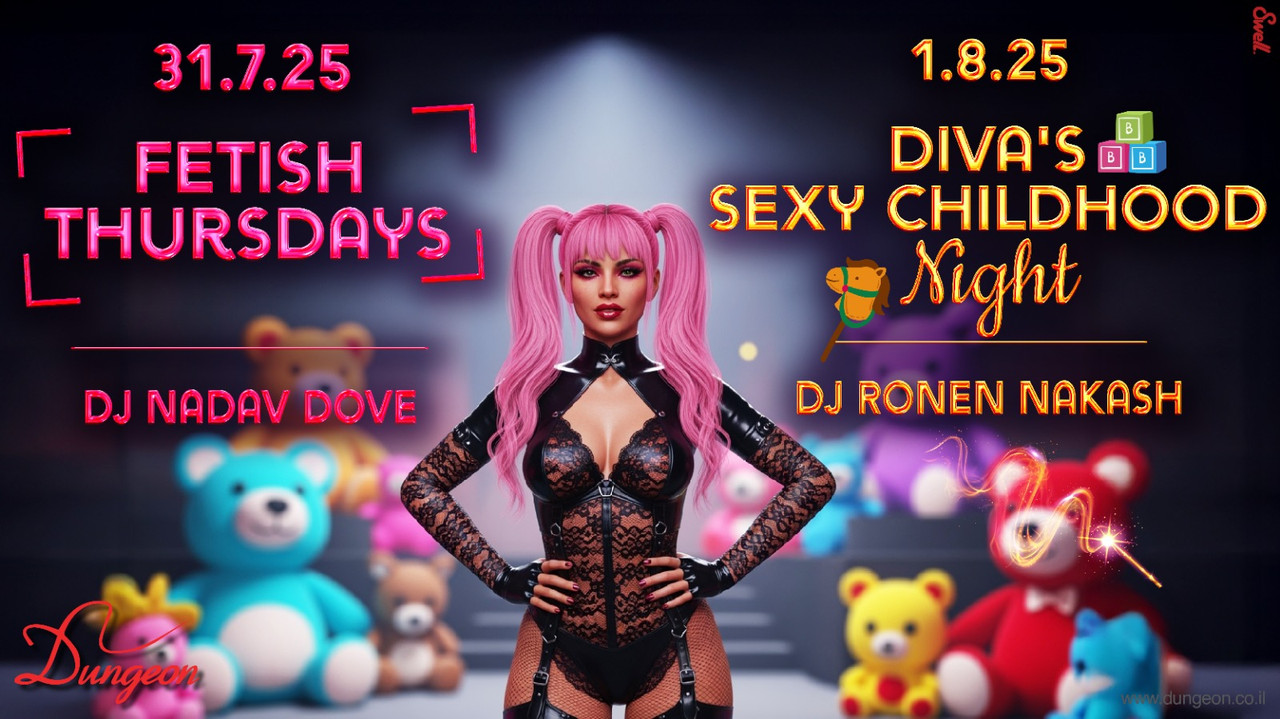 חמישי 31.7 פתיחה בשעה 23:30 Fetish Thursdays Dj Nadav Dove פותחים את הסופ"ש בסערה עם ערב הדגל של המועדון כבר מעל 22 שנים ג'וליאן ההורס על עמוד הריקודים לאחר היעדרות קצרה אך מורגשת, מיכל שלנו חוזרת! המופע המרכזי על הבמה - רועי בעל הנס, ג'דיס ווייט וליאני בלאק צוות הפרפורמרים שלנו על הבמה, עמוד הריקודים, המנוף והחישוק לאורך הלילה כולו לרכישת כרטיסים במכירה מוקדמת עד חמישי בשעה 22:00 (כרטיס זוגי באיזון מגדרי בלבד, המחיר בקופה יקר יותר): https://dungeon.co.il/product/fetish-thursdays-31-7/ שישי 1.8 פתיחה בחצות Diva's Sexy Childhood Night Dj Ronen Nakash בשישי הקרוב אצל דיווה אתם מוזמנים לחזור אחורה בזמן Boys and Girls מה אתם מתכוונים ללבוש?😈 הפעם בדרס קוד ילדותי - גם ורוד הולך מי שישקיע אנחנו הולכים להשקיע בו בחזרה , פרסים שווים בדרך במקום יפוזרו צעצועי ילדות לטובת המשתתפים, כיבוד מתקתק על הבמה המרכזית - 🍭 הופעת שיבארי מחנכת במיוחד של טומאשי ובת זוגתו 🍭 יולי אדום הגננת השובבה בגן הכי קינקי שיש 🍭 פולינה & דוש בריקוד רוקיסטי מסחרר 🍭 בתשי אלופת ישראל בריקוד על עמוד 🍭 אל די.ג'יי נקש על העמדה🎧 תצטרף בנוהל להקת מרקדון לרכישת כרטיסים במכירה מוקדמת עד שישי בשעה 22:00 (כרטיס זוגי באיזון מגדרי בלבד, המחיר בקופה יקר יותר): https://dungeon.co.il/product/divas-sexy-childhood-night-1-8/ חנות הקונספט המטריפה שלנו פתוחה! The Dungeon Concept Shop הכניסה למסיבות מגיל 18 ומעלה ובדרס קוד בלבד: כל מה שקינקי ופטישיסטי, מינימום לבוש שחור מלא ובלי ג’ינס כחול. יש להגיע עם תעודת זהות/רישיון נהיגה (לא צילום בטלפון). יש להישמע להוראות המאבטחים ואנשי הצוות בכניסה ובמקום עצמו. מתחם המבוך המוגדל והמשודרג המפורסם בכל העיר. הכניסה למתחם המבוך לזוגות בלבד. הצילום בכל רחבי המועדון אסור בהחלט! הדאנג’ן – הבית לחובבי הפטיש קינק והסאדו מאזו בישראל מאז 2002, אז תנסו את זה בבית. בשביל מיינסטרים יש מקומות אחרים הארבעה 10 | תל אביב יש חניון שעומד לרשותכם, חניון גבעון – במחיר מסובסד של 15 ש”ח לכל הלילה. מחתימים את הכרטיס בקופת הדאנג’ן